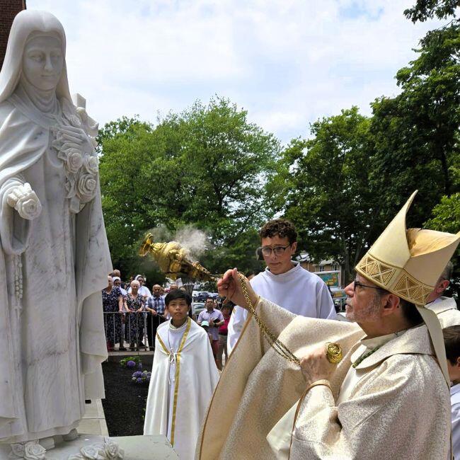 This was not the first time the Church of St. Theresa acknowledged its 75th year. Earlier this summer, the parish marked its founding date — June 19, 1949 — with a celebratory Mass led by Bishop Lorenzo. During his visit, the auxiliary bishop blessed a new statue of St. Theresa that had been erected in the anniversary’s honor. The parish community then enjoyed a block party, which included rides, games, and a food truck.