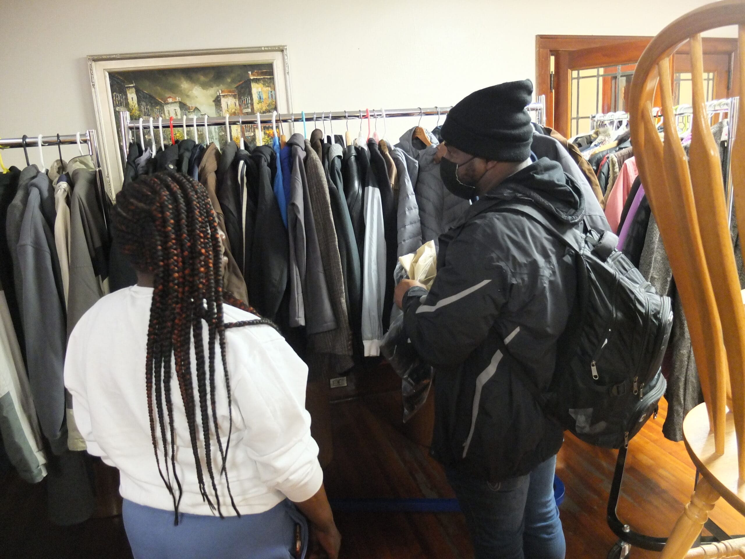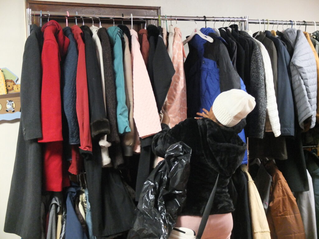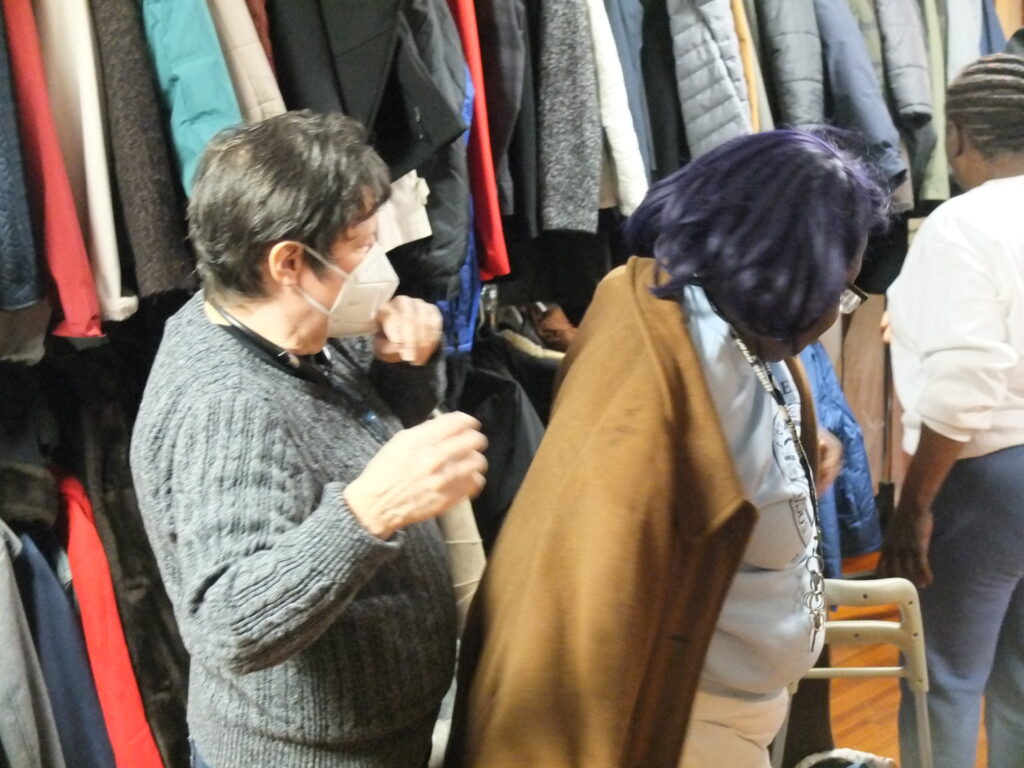 Featured image: Christine Geiges-Krey (center), the archdiocesan Respect Life Office’s administrative assistant, helps community members pick out coats.