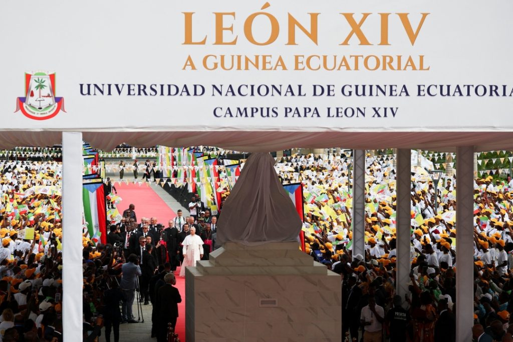 Más tarde, el Papa inauguró un nuevo campus de la Universidad Nacional de Guinea Ecuatorial que lleva su nombre. Los estudiantes se reunieron bajo las palmeras cantando y vitoreando su nombre en español cuando llegó a las modernas instalaciones universitarias.