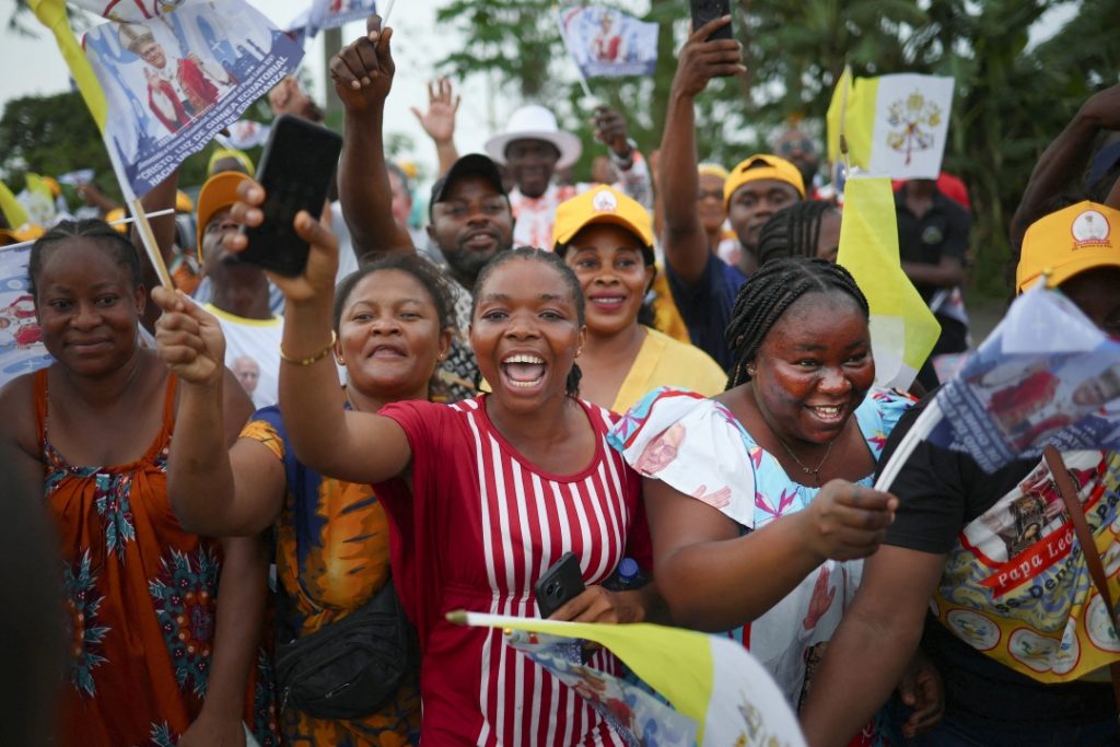 El Papa voló hacia el noroeste desde Luanda, Angola, cruzando África central antes de aterrizar en la isla de Malabo, que fue la capital del país hasta enero. Multitudes se alinearon a lo largo de las calles desde el aeropuerto hasta el palacio presidencial, ondeando banderas del Vaticano y vitoreando mientras el Papa León pasaba en el Papamóvil. Muchos llevaban gorros amarillos con su imagen, mientras que mujeres con vestidos de colores vivos adornados con su imagen bailaban y cantaban.