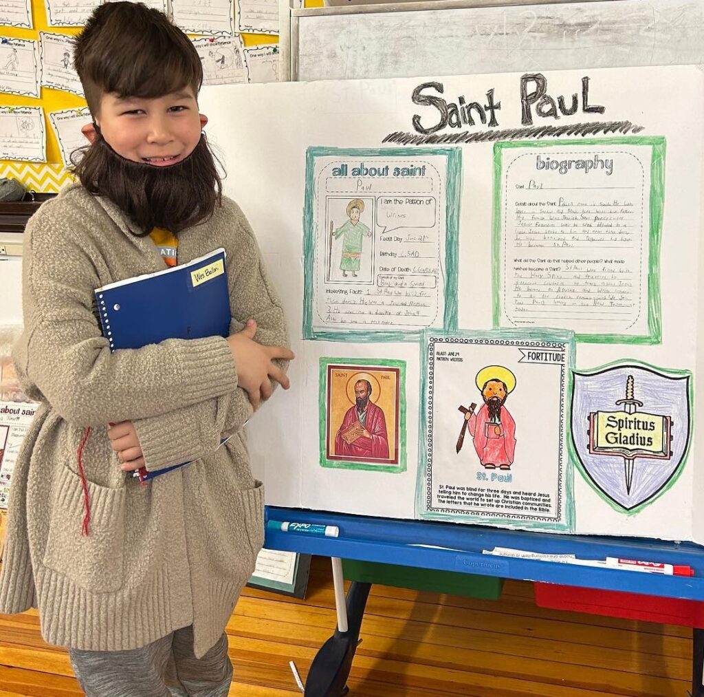 O’Connor said she also aims to integrate religion across subjects, exemplified by a biography project on Catholic saints she conducted with her 3rd-graders during their non-fiction reading and informational essay writing unit last school year. The students researched and wrote essays about Catholic saints, then hosted a gallery walk where they dressed up as their assigned saints and educated parents, teachers, and peers based on their research. She viewed the unit as a chance for students to learn about Christ-like figures while also practicing research and writing skills.