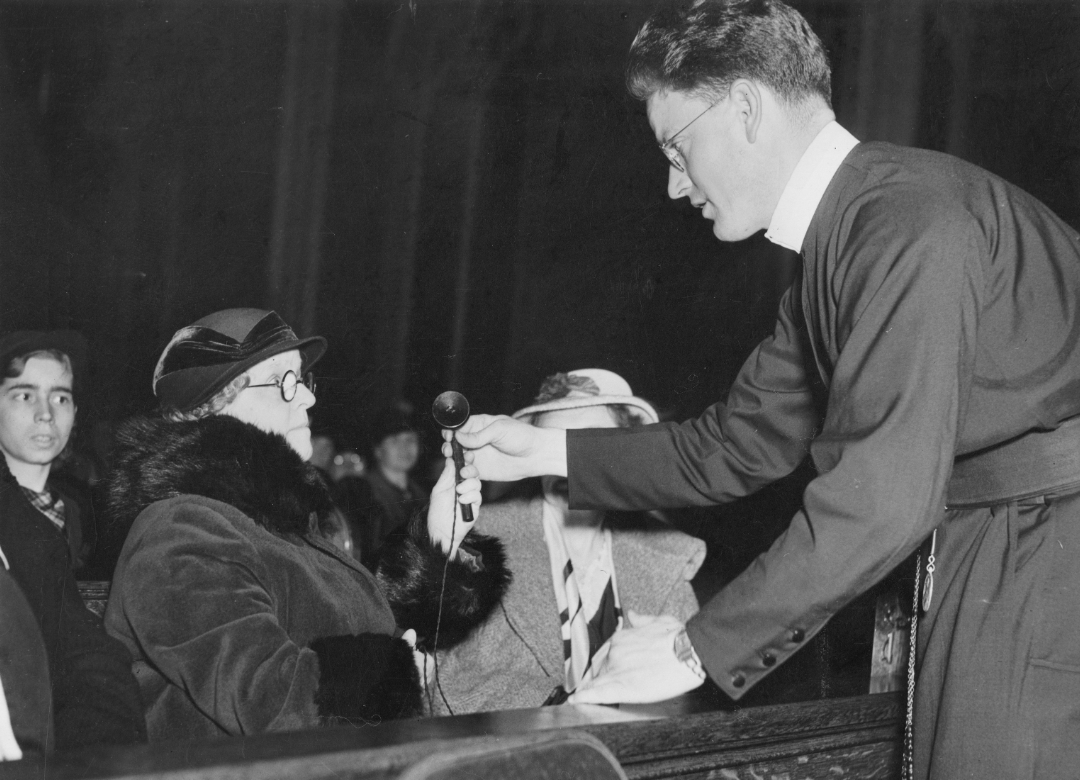 Father Stephen Landherr presents an acousticon listening device to Deaf parishioner Nellie Holliday at a convention for the Apostolate for the Deaf at St. Patrick’s Pro-Cathedral on October 17, 1937. Fr. Landherr, a Redemptorist priest and sign language interpreter, was well known for his work in Deaf communities.