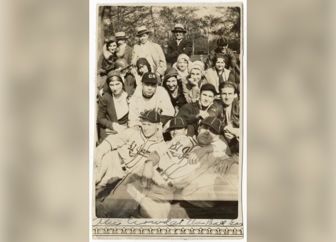 Members of the St. James, Newark Holy Name Society baseball team pose with spectators at a game, c. 1920s.