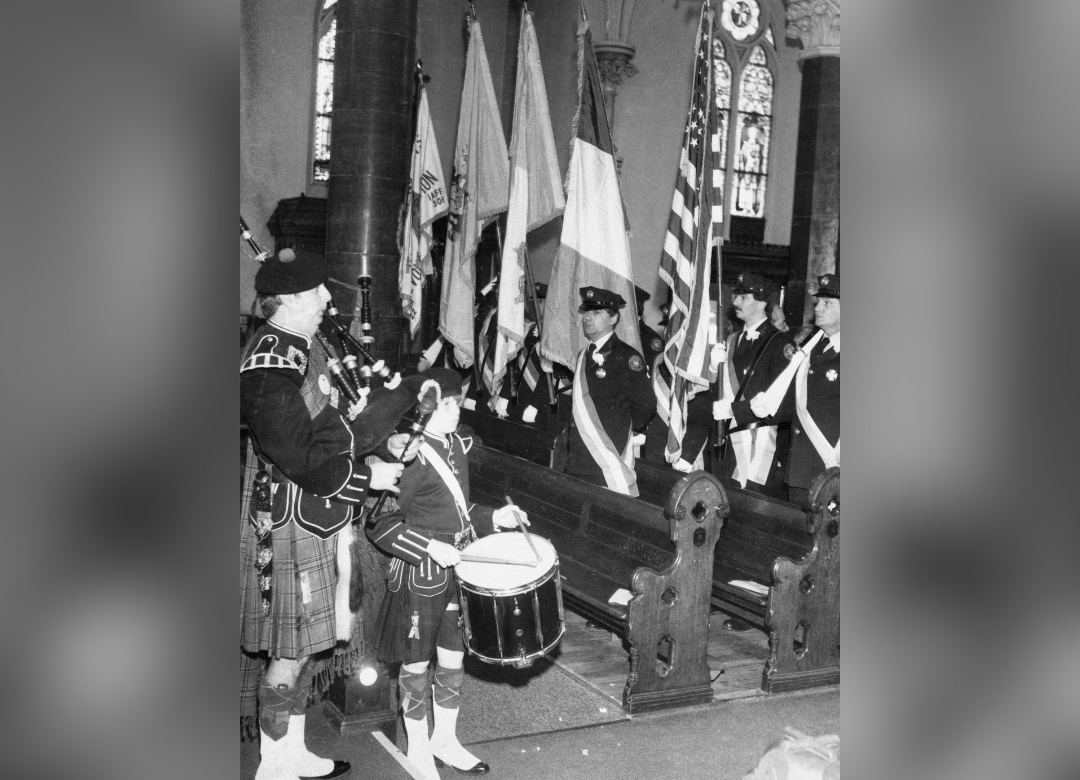 A Mass was offered for peace in Ireland at Holy Cross Parish in Harrison on March 11, 1984. Members of the Harrison Fire Department, seen in the background, listen to Fran Raftery, piper.