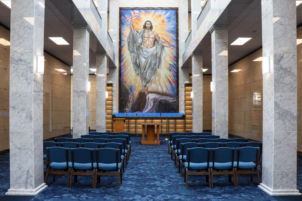 The Chapel Mausoleum of the Resurrection also features a stained-glass window titled “The Peacemakers,” inspired by the Sermon on the Mount, and features Christ with the 12 Apostles. The window was saved from the former Sacred Heart Church in Vailsburg and was installed on the second floor in the new cremation chapel on the opposite side of the mosaic.