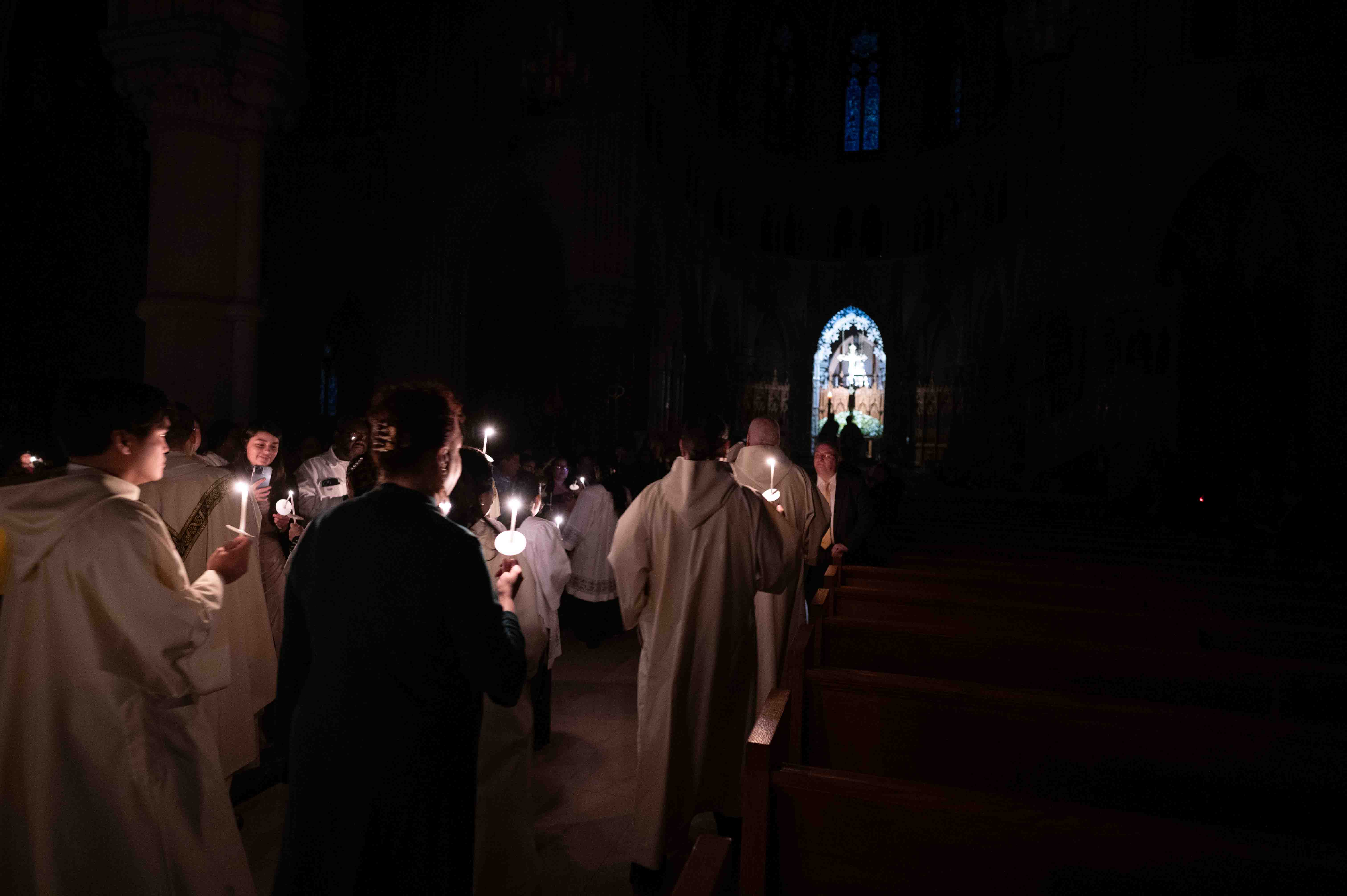 The faithful then lit their own candles and entered the dark basilica as the priest sang out “The light of Christ,” responding with “Blessed be to God.” The lights were slowly turned on, and the Paschal Candle was placed in the sanctuary.
