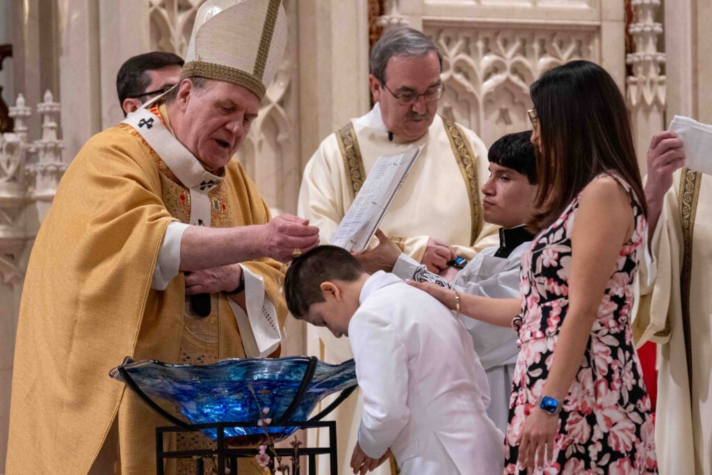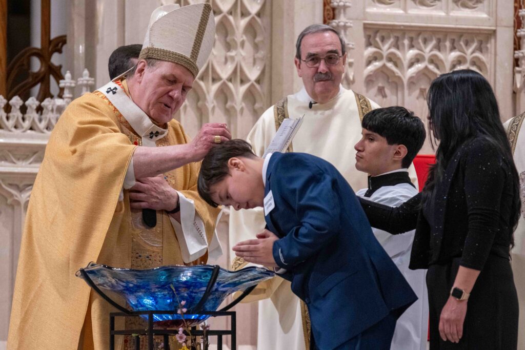 During the Liturgy of Baptism, the 18 catechumens were called to the baptismal font, where they bowed their heads and had blessed water poured over them by Cardinal Tobin. They were then given white garments to wear, anointed with the oil of catechumens, and confirmed by Cardinal Tobin.