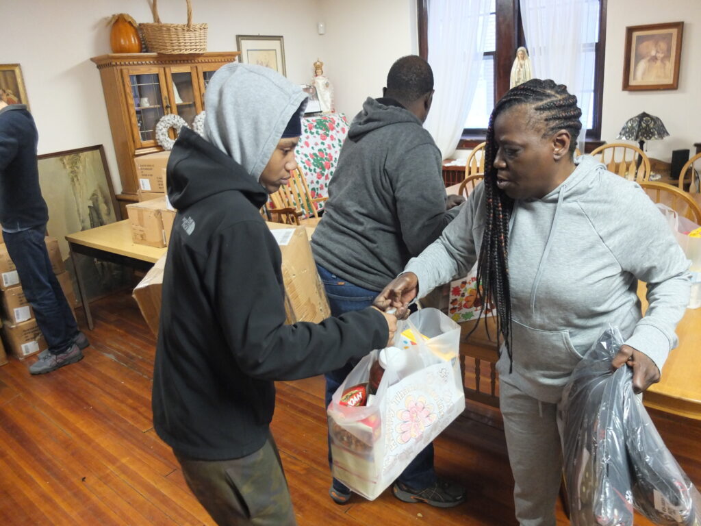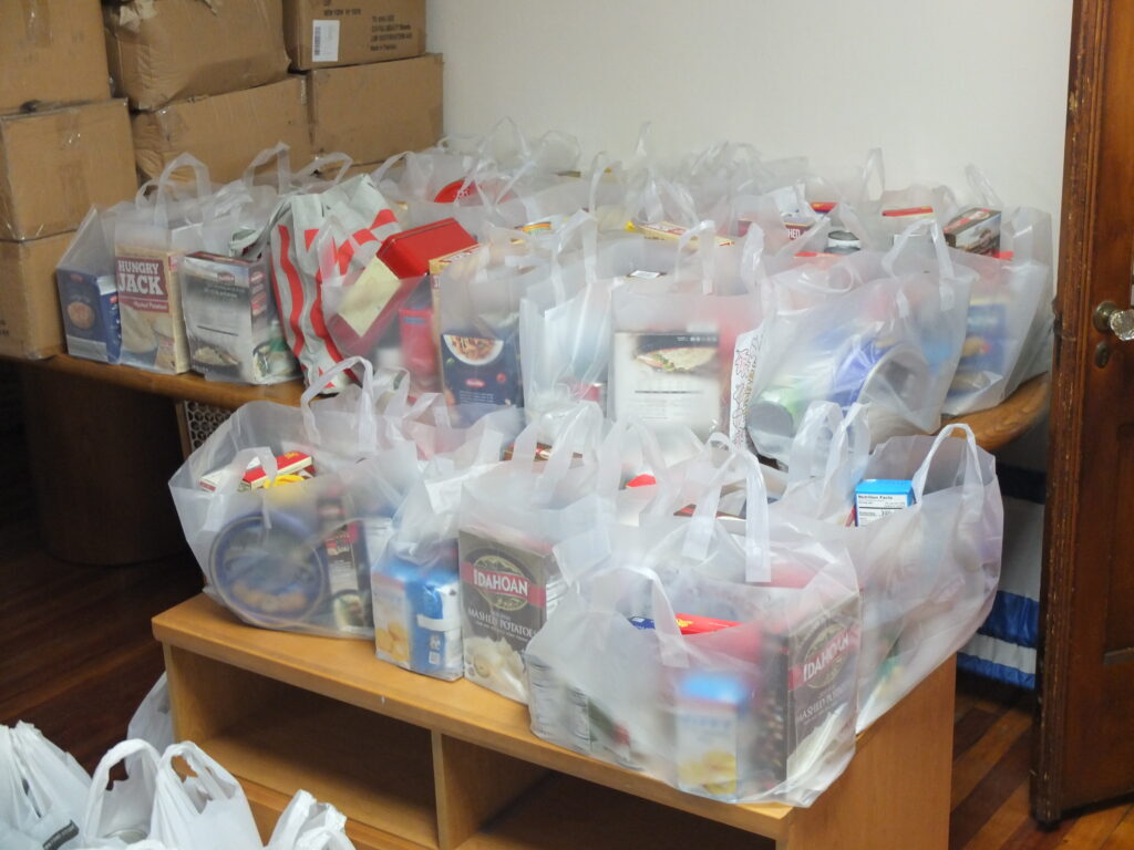 Bags of Thanksgiving trimmings and activity bags for children were packed and delivered by students at Christ the Teacher School in Fort Lee. Each bag also included a drawing of a turkey, colored by the students. Additionally, the week before the giveaway, students from Roselle Catholic High School traveled to The Mercy House to deliver and organize supplies for the giveaway.