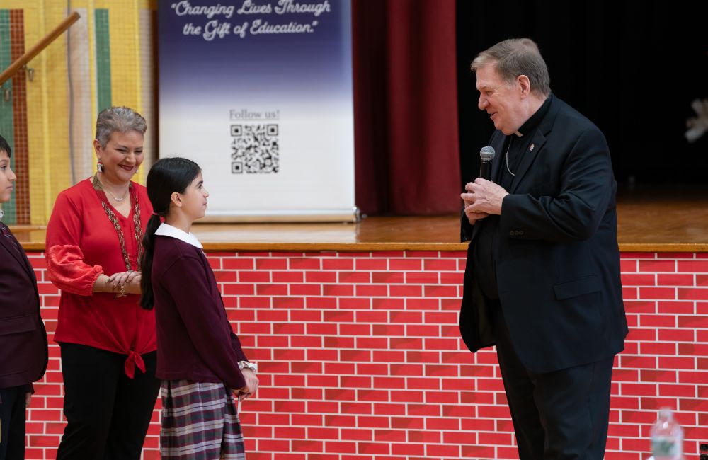 All enjoyed a buffet of breakfast favorites, including sausages, eggs, and pastries, in the festively decorated school gym. Following the meal, Cardinal Tobin engaged with the students by answering their questions about his vocation and what inspired him to become a priest.