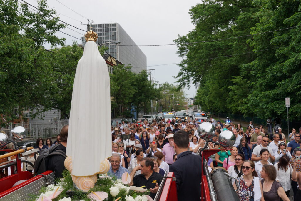 Father Kilgore and Casimiro led the procession of Our Lady of Fatima through Newark on her feast day. While the faithful mostly carried the statue, on hills Our Lady was placed on a vintage fire engine used for firefighters’ funerals who died due to 9/11. Officers from the Newark Police Department also accompanied the procession.